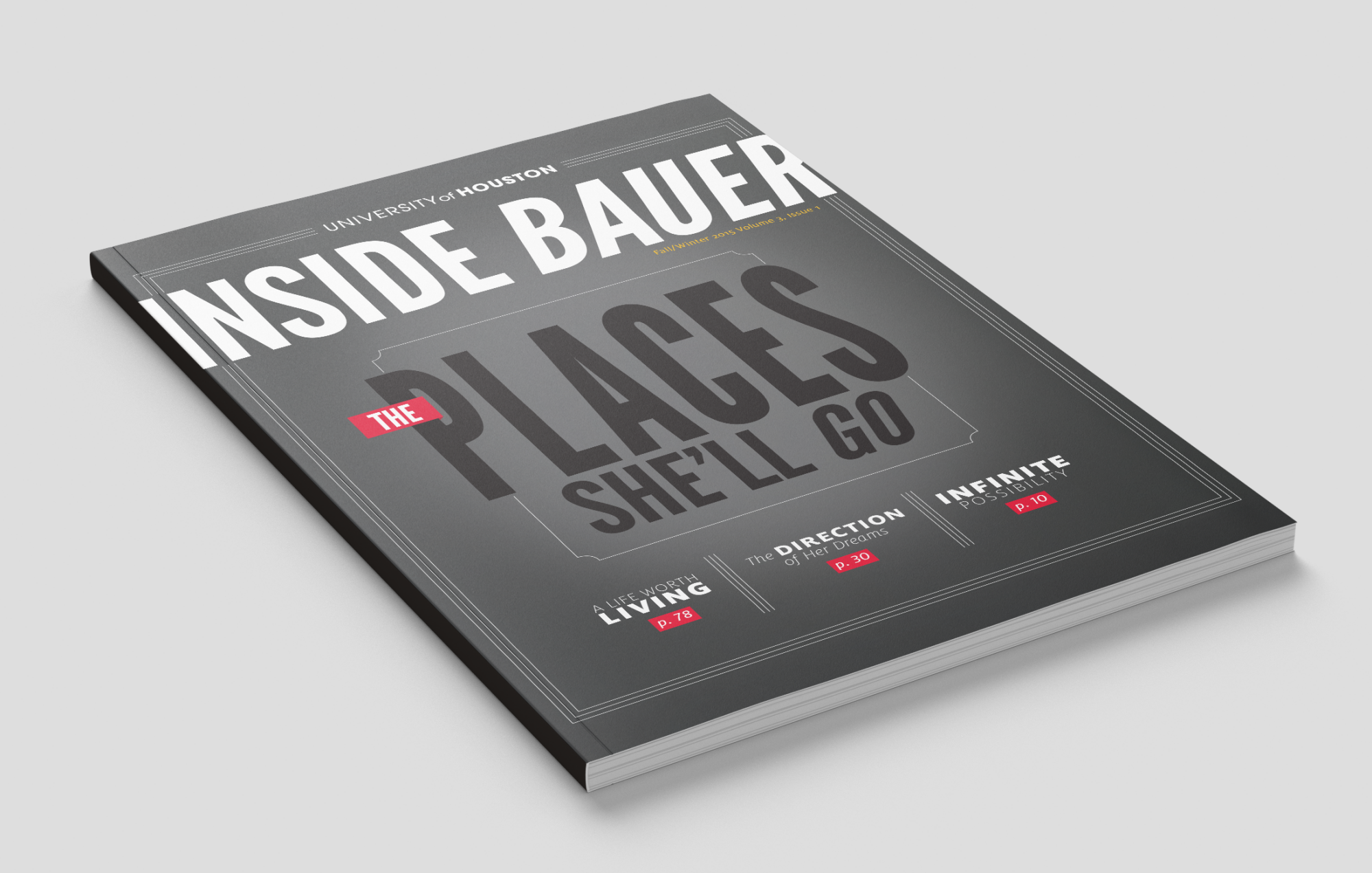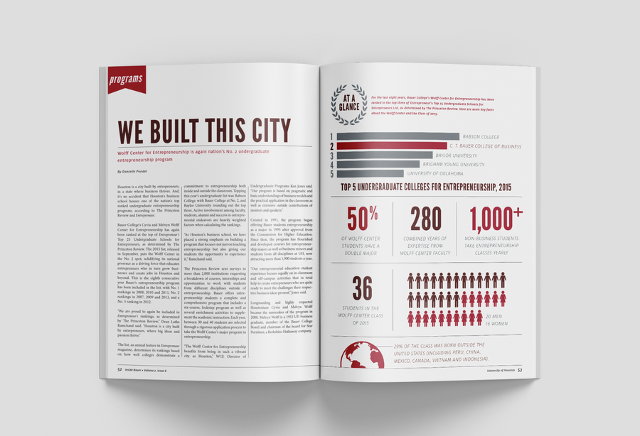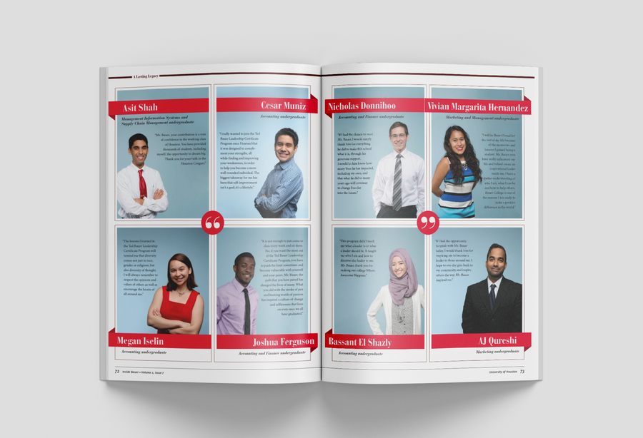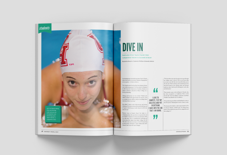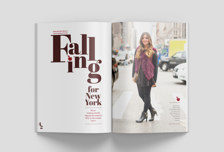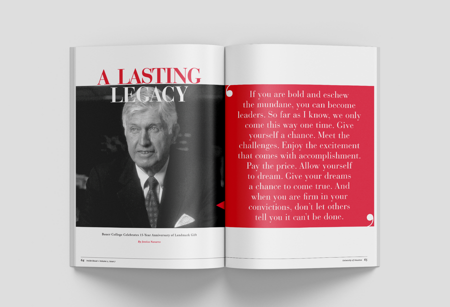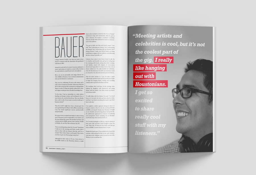 As the college's biannual magazine, Inside Bauer highlights faculty research, student success, innovative programs and alumni impact. This magazine features a complete redesign, including creating new processes to most effectively produce a 100+ page publication while continuing and maintaining the in-house project queue. It grew from a 16-page newsletter to a substantial award-winning lifestyle direct mail piece. In addition to providing an update to the layout design, all photo and video shoots experienced a boost in more creative art direction.