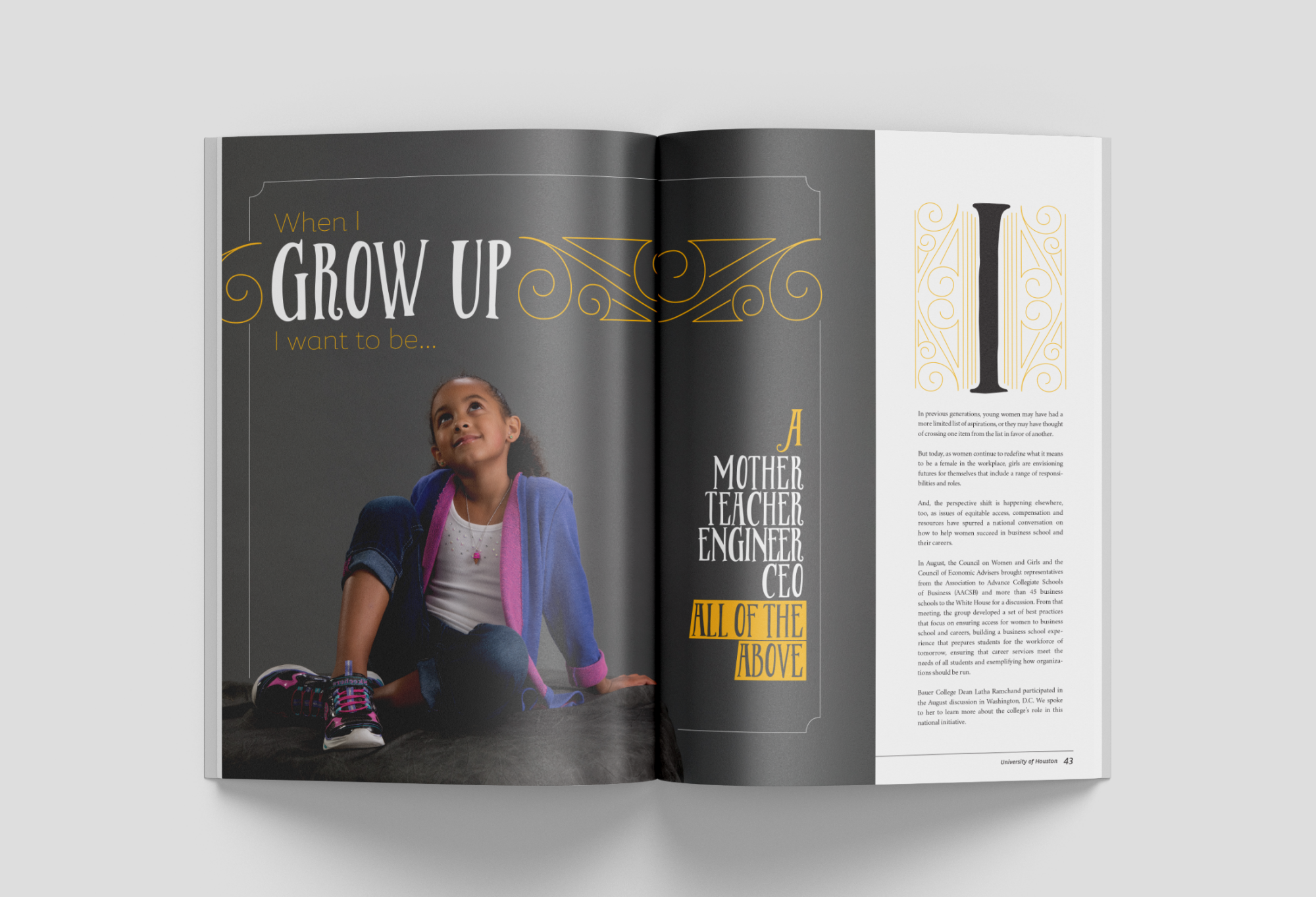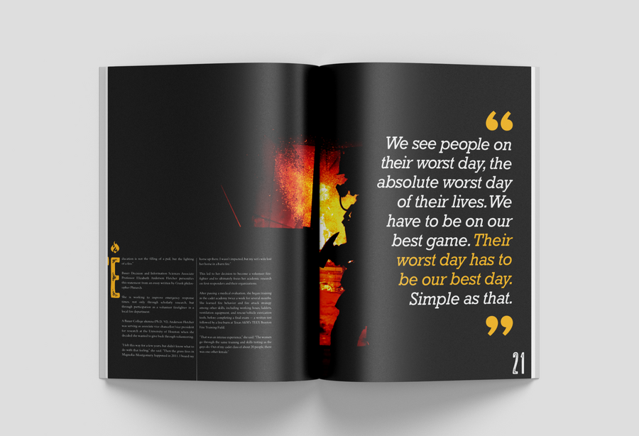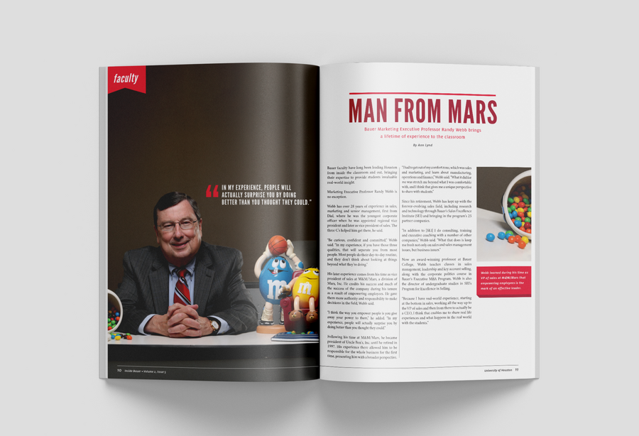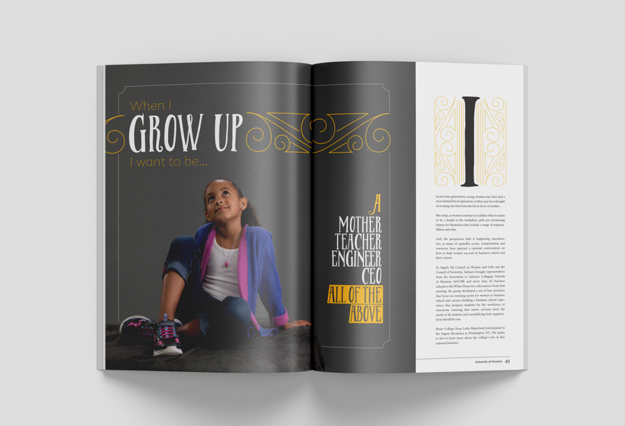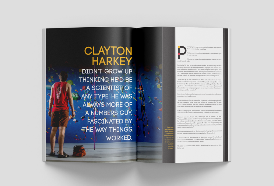 As the college's biannual magazine, Inside Bauer highlights faculty research, student success, innovative programs and alumni impact. This magazine features a complete redesign, including creating new processes to most effectively produce a 100+ page publication while continuing and maintaining the in-house project queue. It grew from a 16-page newsletter to a substantial award-winning lifestyle direct mail piece. In addition to providing an update to the layout design, all photo and video shoots experienced a boost in more creative art direction.