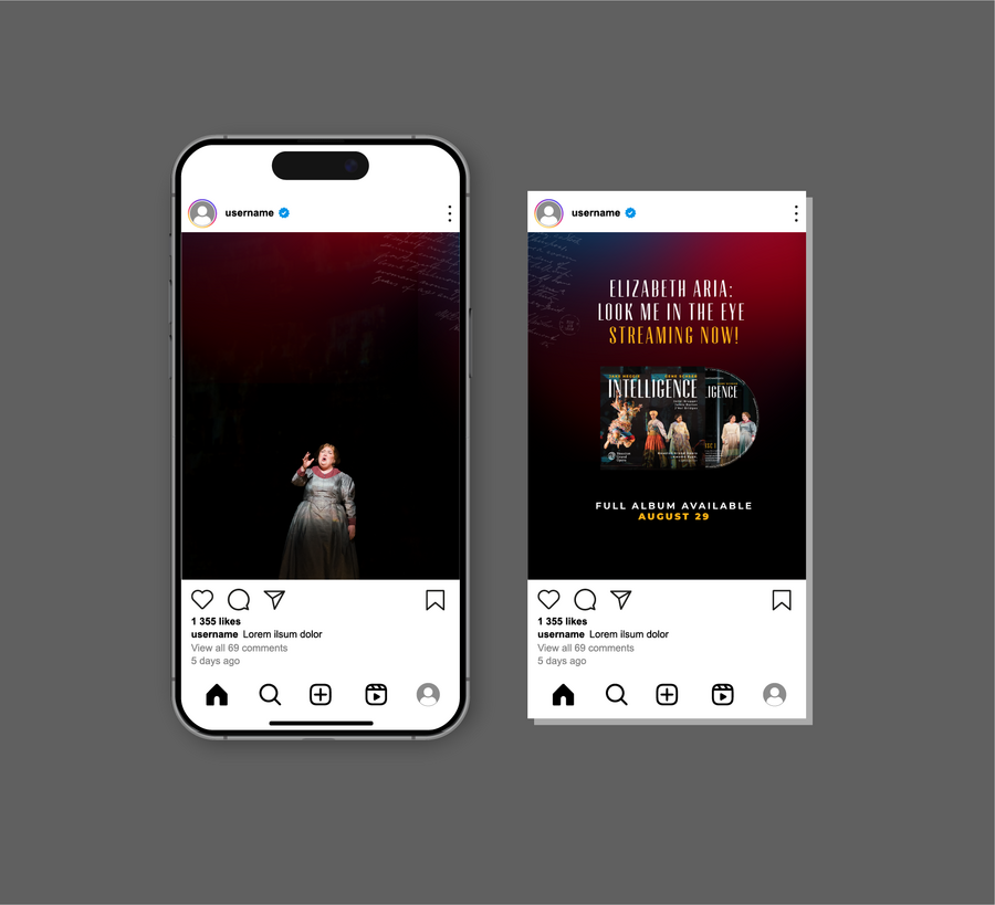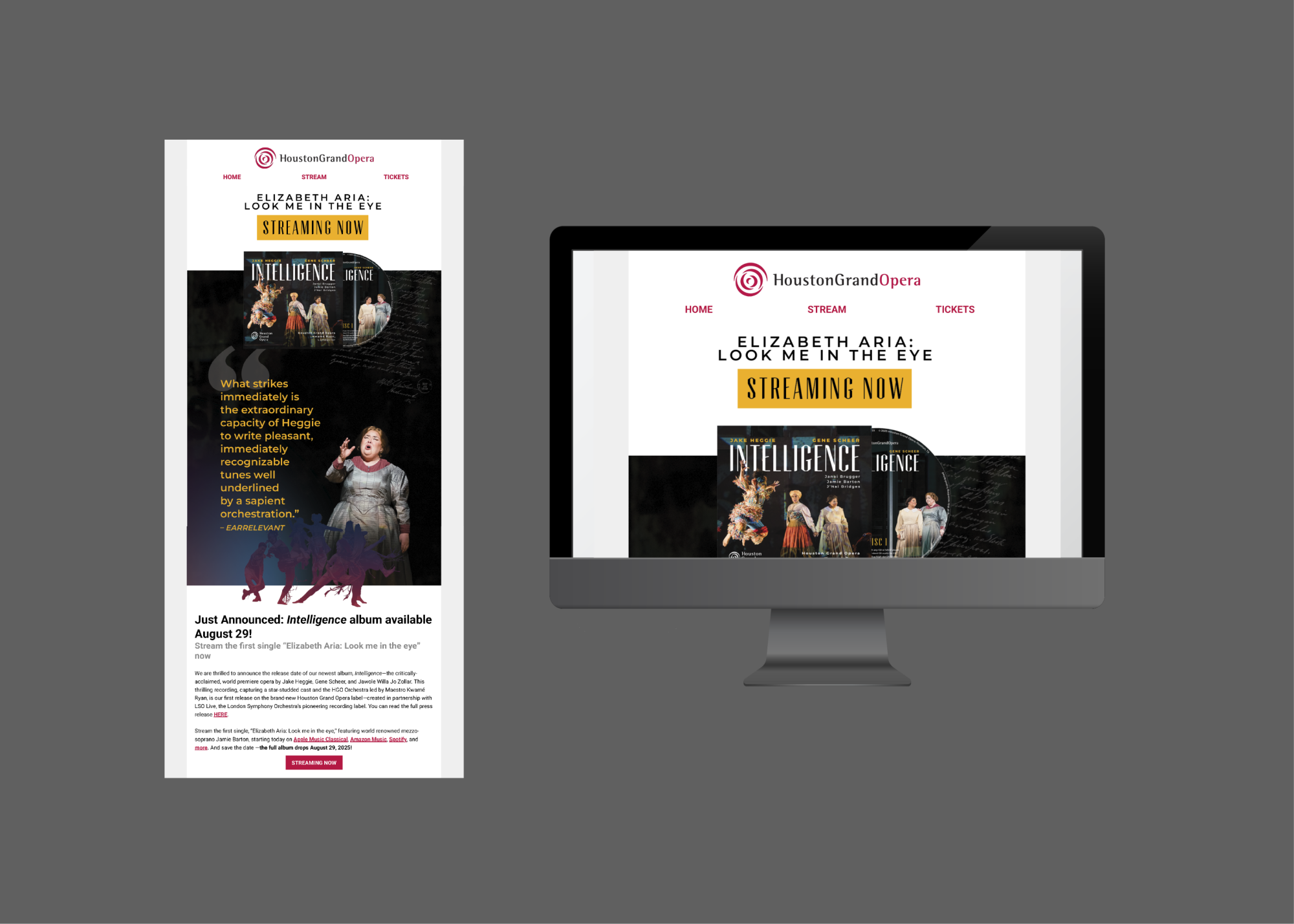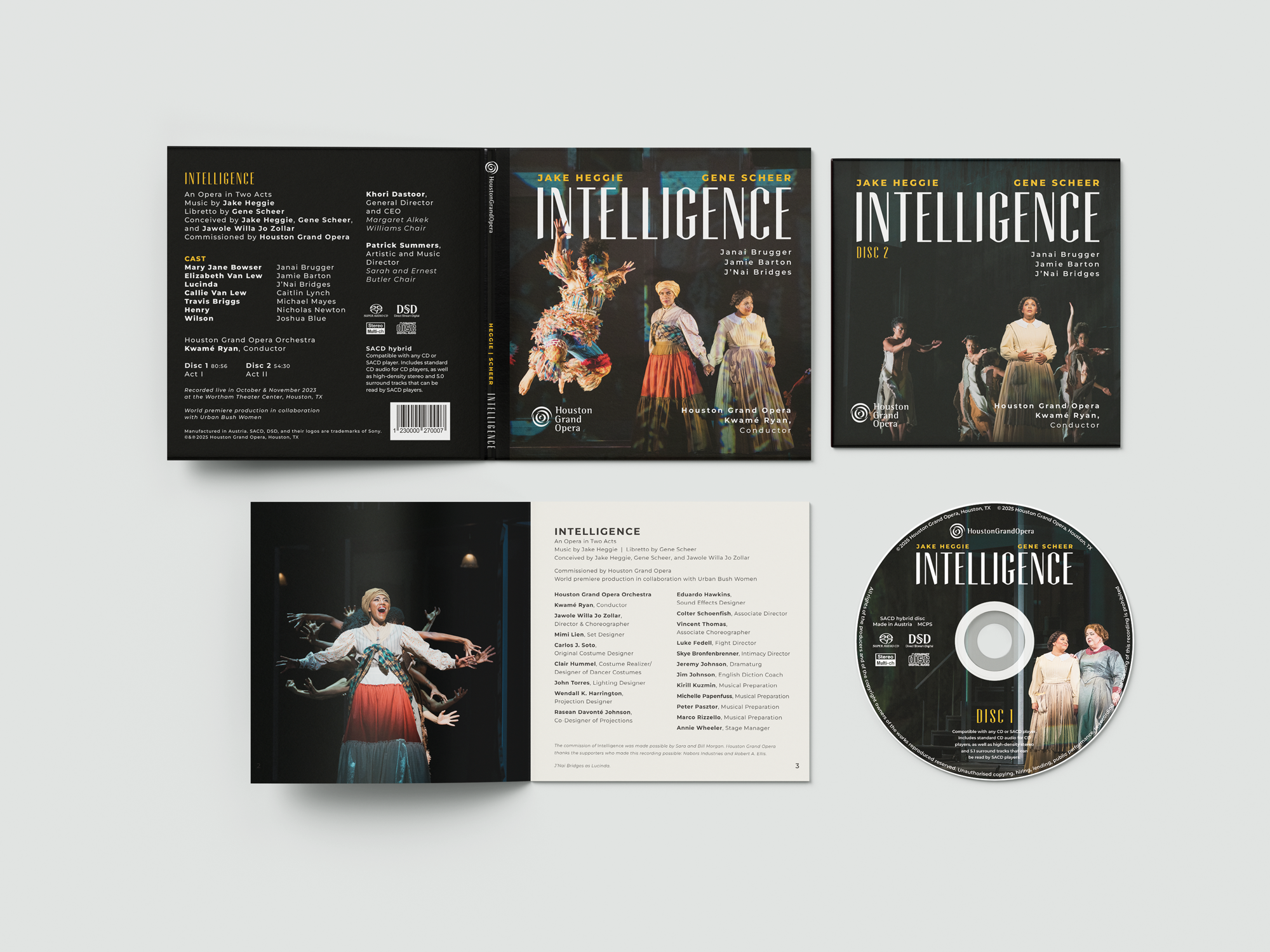 This comprehensive CD package design features photography from local photographer Michael Bishop and focuses on the world premiere performance and recording of the opera Intelligence. The final design was built in collaboration with HGO's recording partners, London Symphony Orchestra (LSO), in Europe and with the partnership of the HGO artistic team. Announcements regarding the CD release were shared via email and various social channels (Facebook, Instagram, X, etc.)